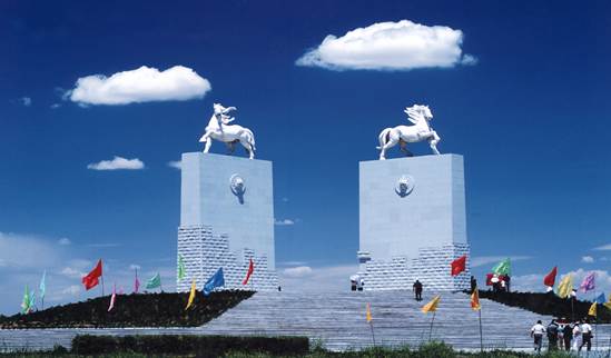 2.气壮山河门景是世界上唯一由成吉思汗跃马雕像组成的山字型门景;
