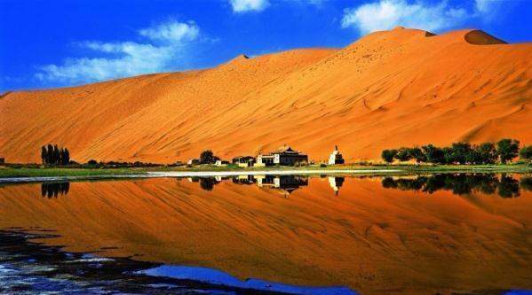 腾格里沙漠是中国第四大沙漠,分布着数百个湖泊,其中月亮湖是有名的原生态湖泊。湖光沙色交相辉映,如同寂寥大漠中的一叶扁舟,具有未经人工雕琢的原生态风貌。