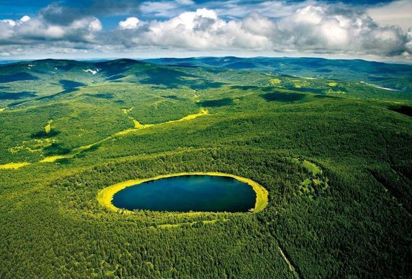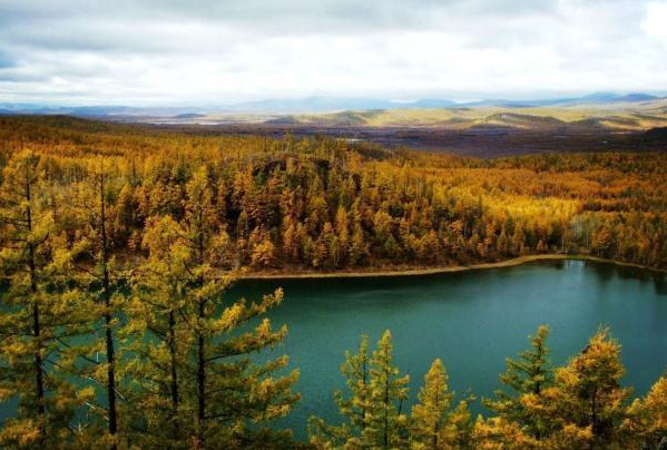 阿尔山天池,位于阿尔山市东北74公里的天池岭上,由火山喷出物落在喷火口周围形成一道环状围墙,中间形成圆形凹坑,多年积水而成。
