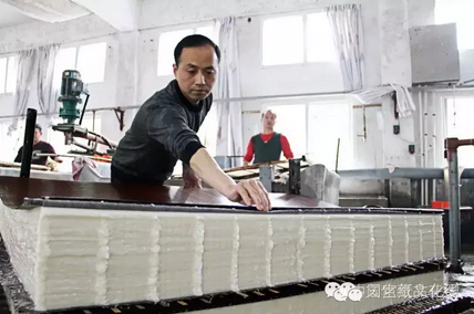 进入技艺展示与体验区,首先看到的就是宣纸原料的“锤炼”过程:精挑细选后的燎草、燎皮用巨大的木槌夯打,目的是把纤维打碎。清代诗人赵廷挥的《感坑》就有描写泾县山溪人家制作宣纸的诗句:“沿溪纸碓无停息,一片舂声撼夕阳。”宣纸制作心手相传,古老的工序仍旧沿用至今,只是在技术上有所改进,比如石碓碓皮,过去是水车带动,现在是电力带动。