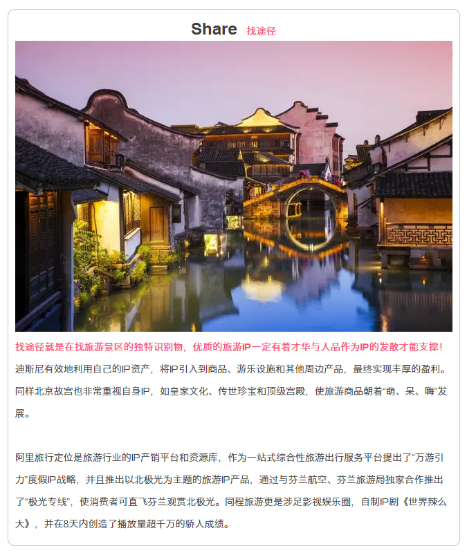 而旅游IP代表着个性和稀缺性,对景区而言,是景区形象认知的产品,简单鲜明有特色的元素和符号。旅游景区的IP可能就是一个故事,可能是具体的某一个景点,也可能是一个某一种感觉,它赋予旅游景区独特的性格特点,也给予了景区生命力。