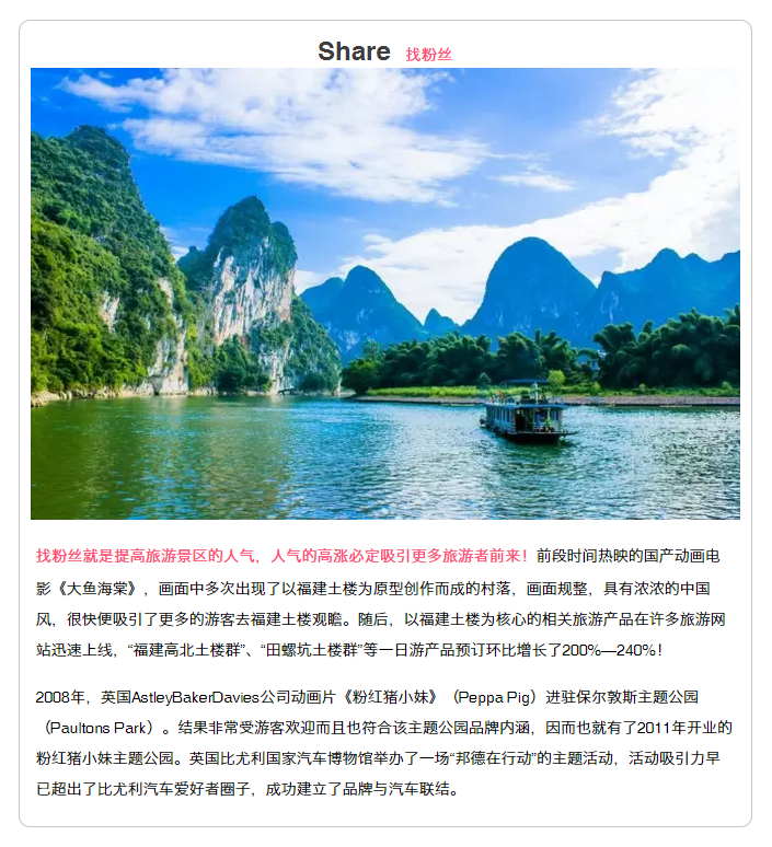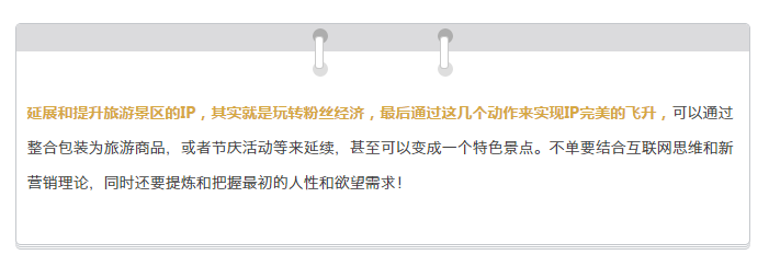 从提供服务到用户尖叫,人性化的口碑传播,无可比拟的体验与参与感,是建立强黏性的前提。可以通过整合包装为旅游商品,或者节庆活动等来延续,甚至可以变成一个特色景点,参与感的提升可以见证这个景区的人气度,多元化的融合更能维持旅游景区IP的生命力!