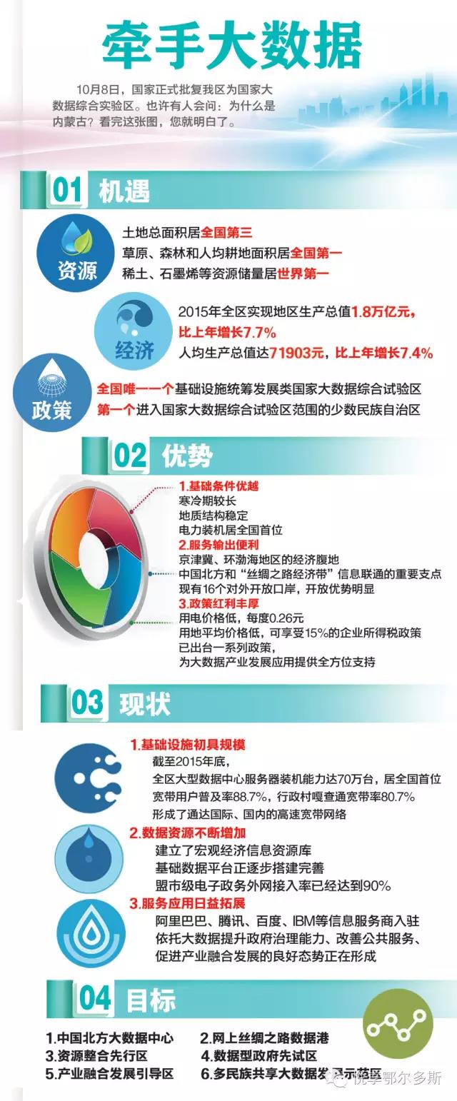 鄂尔多斯市发展大数据产业有着独特的区位、气候、地质、电力、政策优势和条件。鄂尔多斯市于2009年就开始发展云计算产业, 2010年被内蒙古自治区政府确定为全区云计算产业发展重点地区。2013年顺应形势,积极延伸产业链,打造云计算大数据基地。近日,国家发改委、工信部、网信办联合批复内蒙古为全国唯一一个大数据发展综合试验区。鄂尔多斯作为呼包鄂协同发展的重要一级,发展大数据产业潜力巨大、优势明显、前景看好。