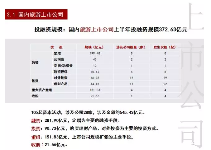 国内旅游上市公司上半年投融资规模372.63亿元。上半年国内旅游上市公司共有105起资本活动,涉及公司28家,涉及金额约545.42亿元。其中,融资规模为281.90亿元,定增为主要的融资手段;投资规模90.73亿元,购买理财产品、对外投资为主要的投资方式;兼并重组规模为173.49亿元,上市公司规模扩张的主要手段。