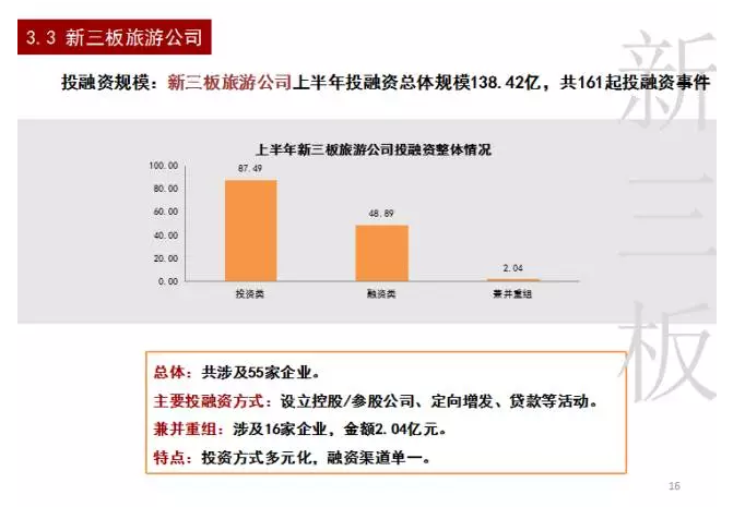 新三板旅游公司上半年投融资总体规模138.42亿。新三板旅游类企业共发生161起投融资及兼并重组事项,共涉及55家企业,主要投融资方式有设立控股/参股公司、定向增发、贷款等活动。其中,投资活动涉及资金87.49亿元,占比63.21%;融资活动涉及资金48.89亿元,占比35.32%;兼并重组事项涉及金额2.04万元,占比1.47% 。