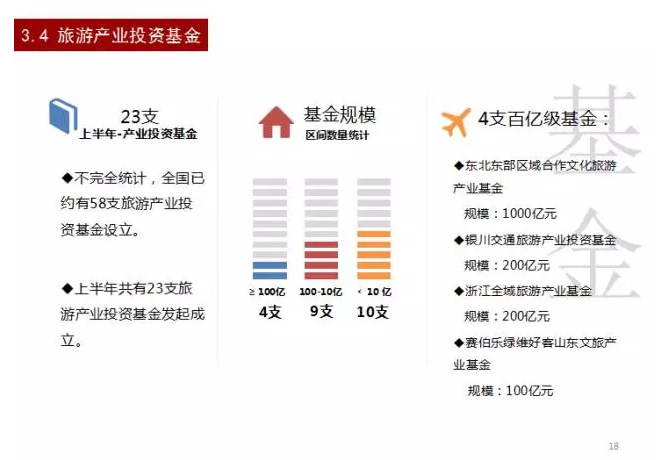 上半年共有23支旅游产业投资基金成立。据不完全统计,全国已约有58支旅游产业投资基金设立,今年上半年共有23支旅游产业投资基金发起成立。据不完全统计,全国已约有58支旅游产业投资基金设立,今年上半年共有23支旅游产业投资基金发起成立。其中百亿级以上的共4支,分别是东北东部区域合作文化旅游产业基金、银川交通旅游产业投资基金、浙江全域旅游产业基金和赛伯乐绿维好客山东文旅产业基金。