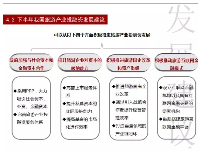 趋势展望及建议。本报告对旅游产业投融资未来发展进行了展望,也对未来旅游资本市场的发展提出了相关建议。报告指出,大型旅游国企并购重组、民企对旅游战略性投资仍将继续深入;“旅游+互联网”的垂直产业链整合将成为未来的投资重点; PPP模式将成为未来旅游产业开发的主要合作模式。同时也建议政府加强与社会资本和金融资本合作,积极推进旅游国企改革和资产重组,积极推动旅游互联网金融模式发展等。