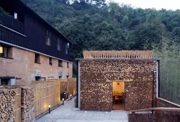 民宿云夕•戴家山设计取材于山林,设屋顶有扫帚墙,300把扫帚由莪山当地农户用自己种的扫帚草绑扎而成,用原始的木头垒起来的外墙装饰呈现了乡土建筑最本真的设计格调,贴近自然,返璞而生态。