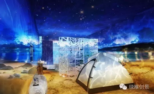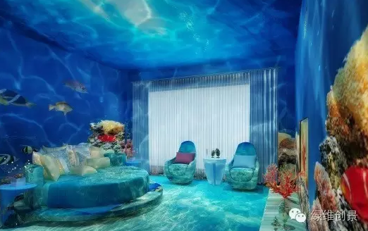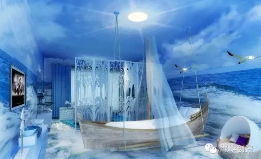 绿维浙江分院设计桃逸时,大胆地将3D全息投影技术同民宿进行无缝对接,借助3D全息投影技术模拟海上、海底和海滩的场景,投影本身内置了真实的音效功能,可以从视觉、听觉方面带给客人不一样的居住体验。