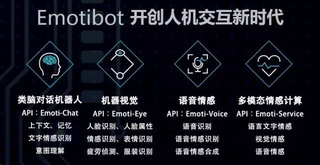 这些其实都源于 Emotibot 的底层机器人算法技术,上述都只是一整套人机交互逻辑中的一个点。Emotibot 还开发了可以在对话框识别文字意图和语音情感的 API 接口,相应也有上下文逻辑连续的文字表达和语音合成程序,这样的拟人化对话输出设计。
