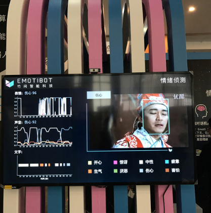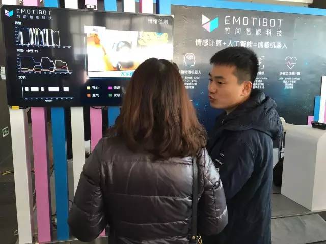 竹间科技的主打产品是 Emotibot,它致力于打造高智商和情商兼备的个人智能伴侣。现场展区的主要位置被两个自带摄像头的五十寸大屏占据。