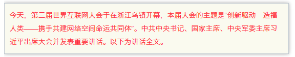 值此第三届世界互联网大会开幕之际,我谨代表中国政府和中国人民,并以我个人的名义,向大会的召开表示热烈的祝贺!向各位嘉宾致以诚挚的问候!