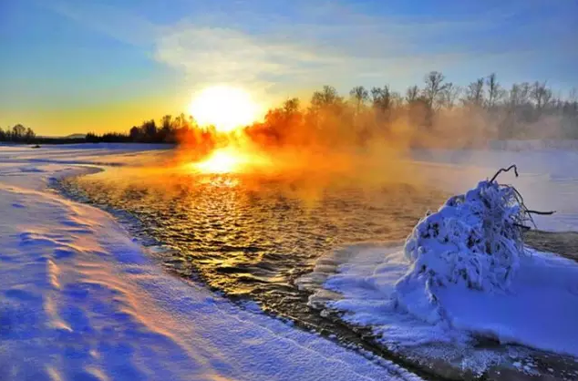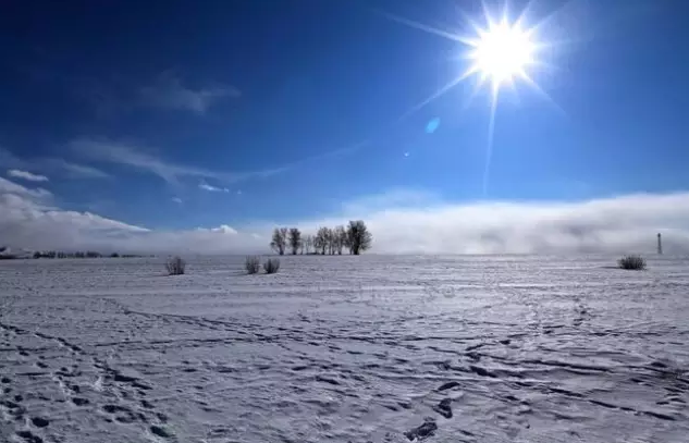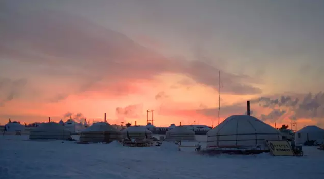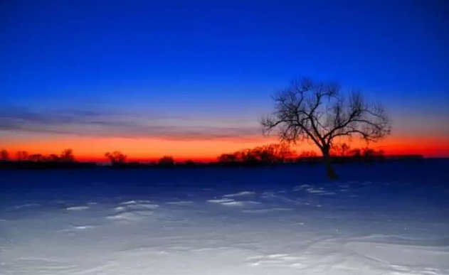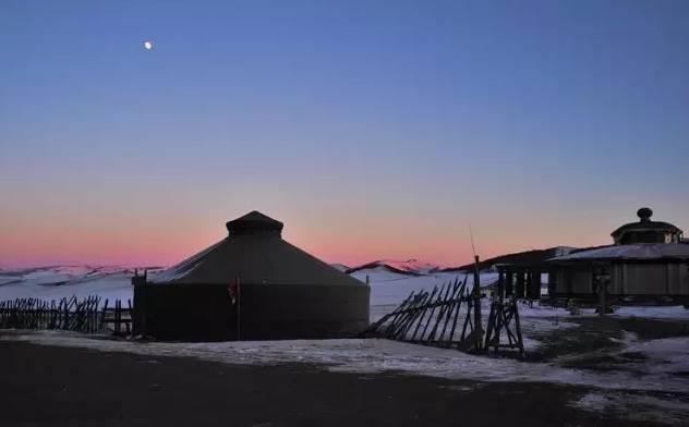日落时分,草原很奇怪,太阳都落山了,天还是那么亮,它金色的余晖把雪盖的草原映得很梦幻。
