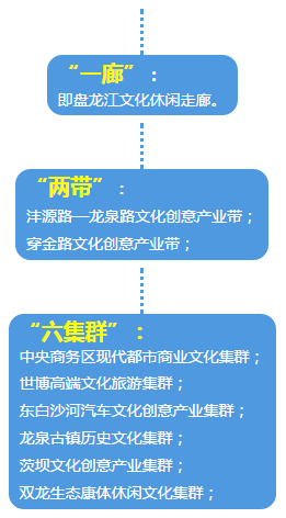 依据盘龙区文化资源分布状况、文化创意产业发展基础和经济发展水平,实施文化创意产业“一廊两带六集群”的空间发展布局。
