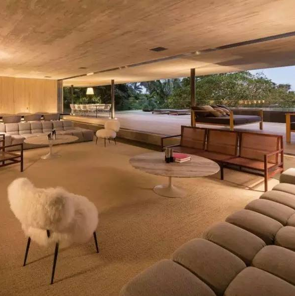 这是一座融入自然的混凝土住宅,屋顶上的游泳池在沿海热带雨林茂密的树冠中若隐若现。室内粗糙的混凝土和木结构都外露可见,并搭配有各种质地的中性色家具。