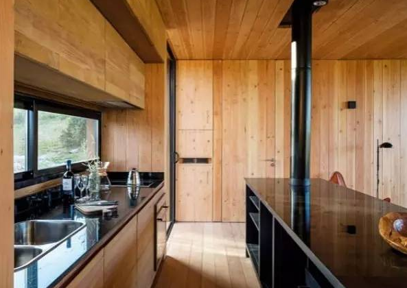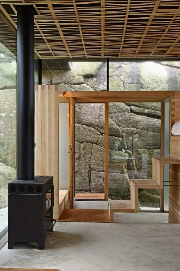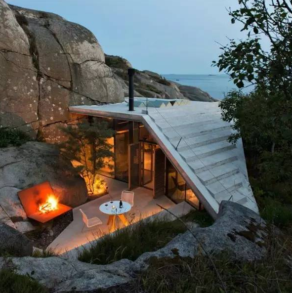 这座小屋建造在斯堪的纳维亚大自然的峡湾中,只有一层,屋顶有巨大的露台。木质的墙壁和家具为房屋增添了一些暖意,浴室可以俯瞰大海。