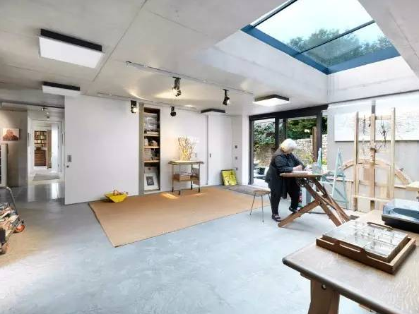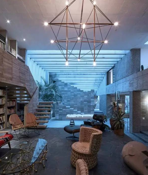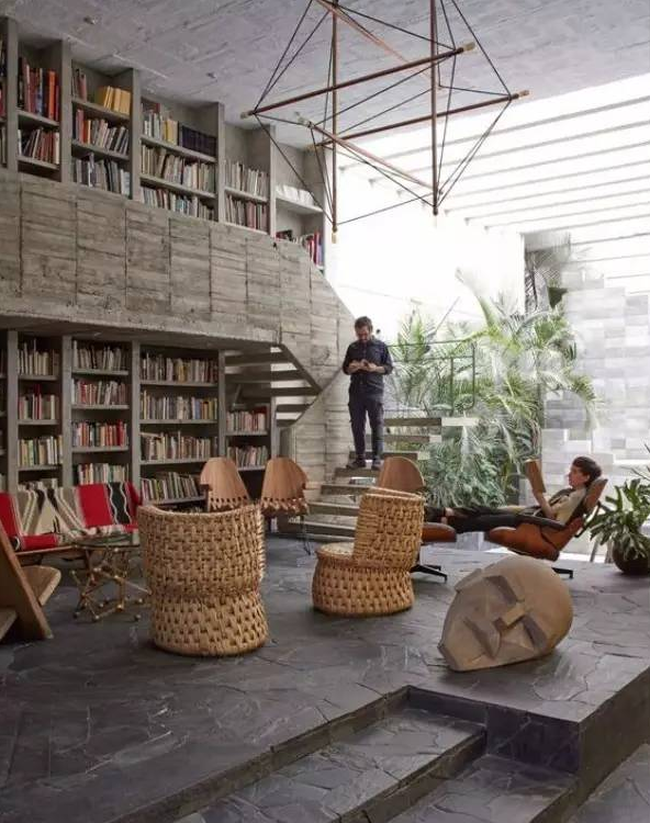 这是一对艺术家夫妇自己设计的一座混凝土住宅,这里既是他们的家也是他们的工作室,充满了现代主义建筑的粗野主义风格。忍不住感叹一句,两层高的书架真的好棒。