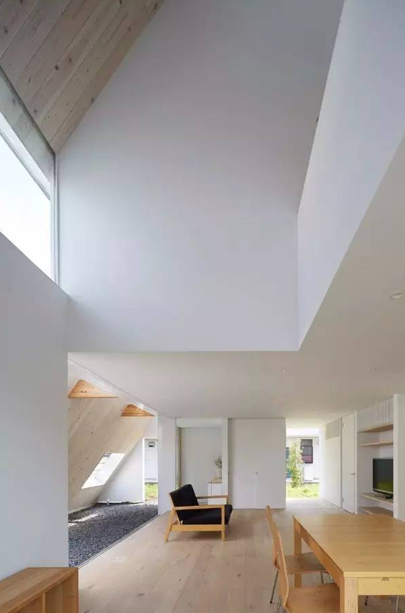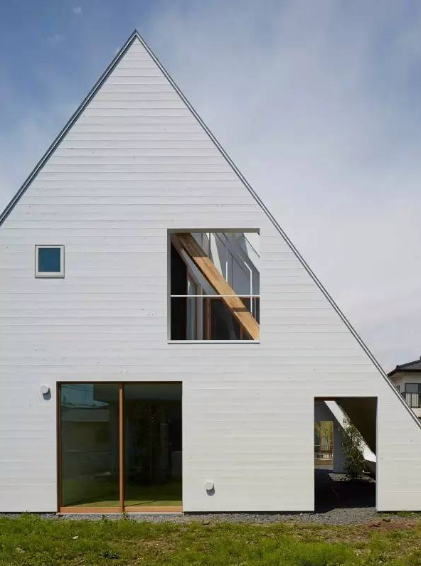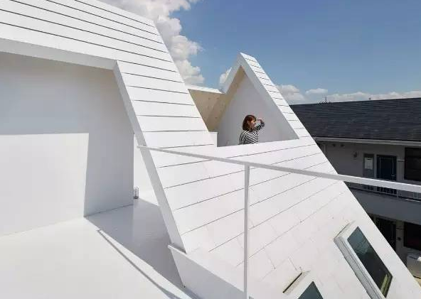 采用了金属屋顶覆盖整个住宅的形式,为露台和花园都提供遮蔽。外立面全都覆盖上了白色镀锌合金板条,庞大的屋顶进行了一系列剪切开洞设计,能使自然光照射进房间和露台。