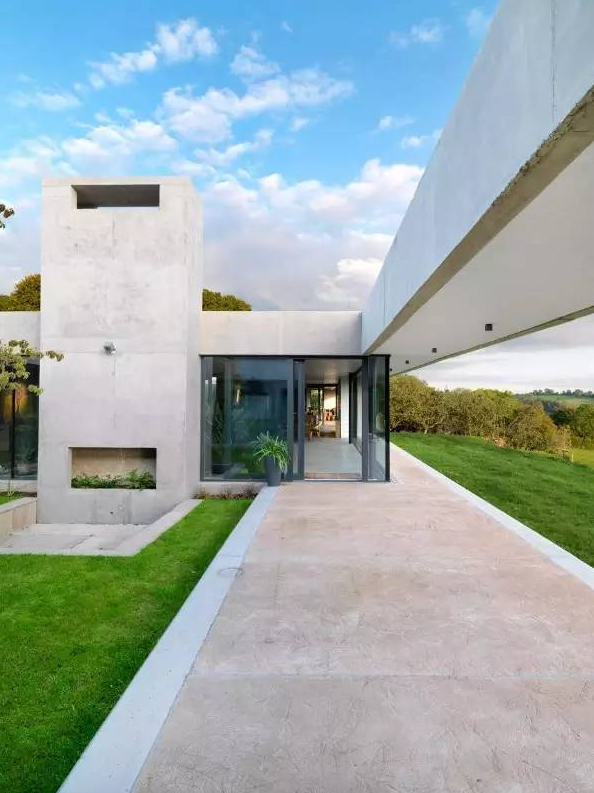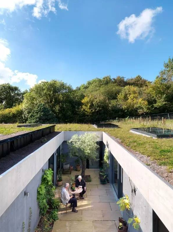 这座英国乡村住宅是一对艺术家的住所和工作室,有着宽阔的草坪屋顶、玻璃围合的庭院。住宅依偎在地形之中,从北面基本上看不见它。