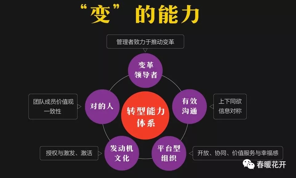 我对很多企业很紧张,就因为大部分中国企业都比较关心一些「新」名词,延用的一些旧的思维逻辑。比如说,很多企业认为自己是生态型企业,可是这些企业的领导者不知道,其实他们还是用了工业时代的思维方式,今天我非常希望有一个彻底的改变,这里边就要求你有变的能力,这个能力从管理者到沟通到平台组织,到文化,最后是对的人,注意,我用了一个「对的人」,我没有用「能人」,「对的人」就是价值观必须一致,如果价值观不一致,你再有能力也不行,因为今天变化太大,我们唯一需要笃定的东西就是价值观的一致性。