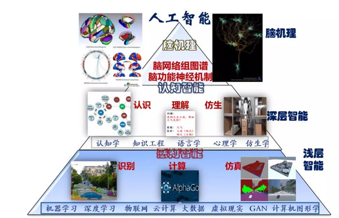 所谓人工智能就是使机器能够模拟、延伸和扩展类人智能的理论、方法、技术及应用系统。归纳下来主要包括三方面的内容。首先是对人及动物组织机理的研究,主要剖析活体动物的大脑功能组织机制及肢体运动结构。二是认知智能,即分析脑及肢体活动内在规律及物理原理,建立类脑的思维组织与理解模型及肢体运动仿生模型。三是感知智能,与认知智能相对应,感知智能主要从脑及肢体活动的外在表现来识别、计算和模拟仿真人类的智能,主要采用的是统计和模式学习的计算方法,并不要求一定具有物理意义上的原理解释。