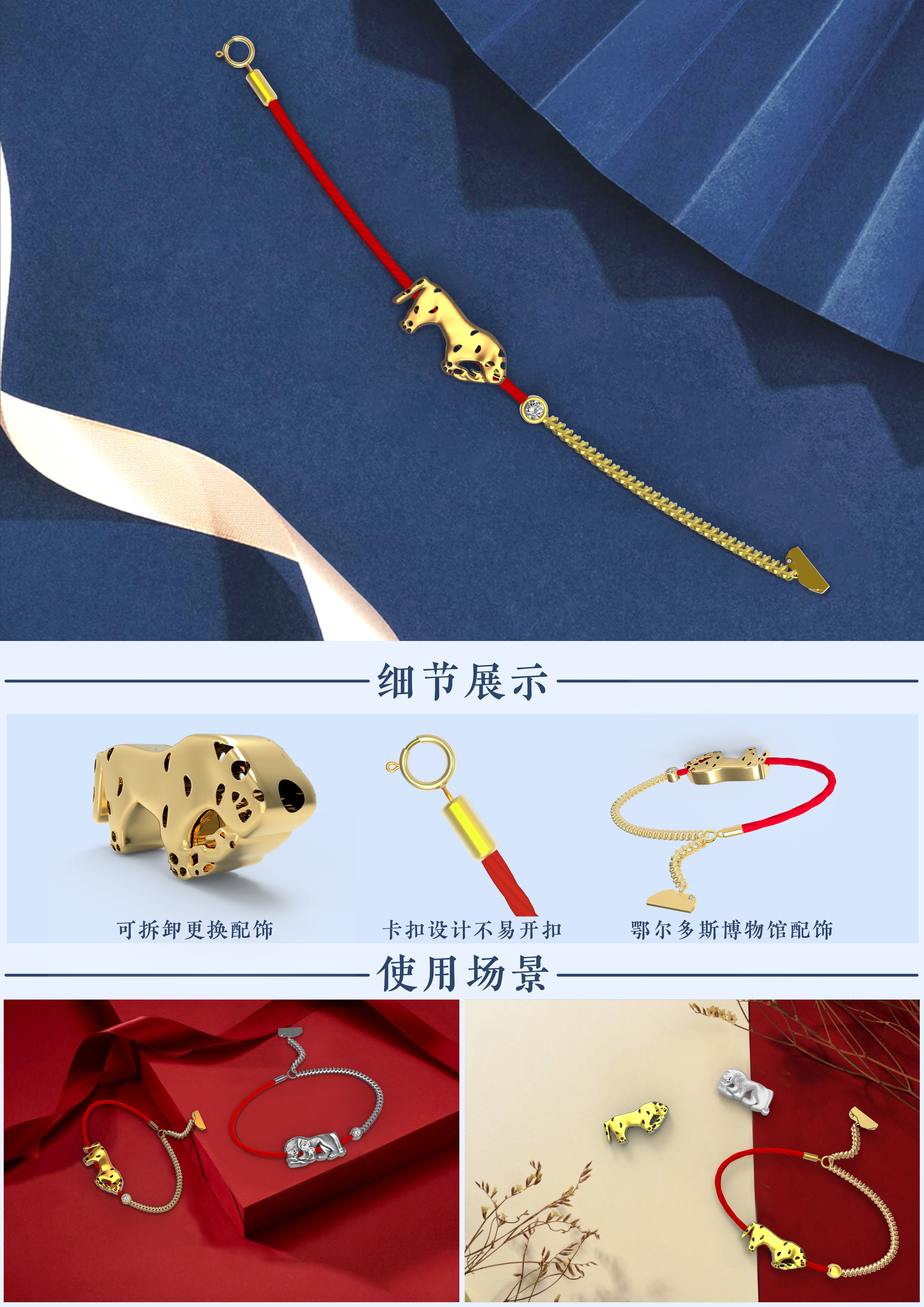 创作思路:以鄂尔多斯博物馆中的展品战国虎咬鹿纹银饰牌、战国镂空虎衔兽纹金饰牌以及鄂尔多斯博物馆为形态设计的可拆卸手链配饰。