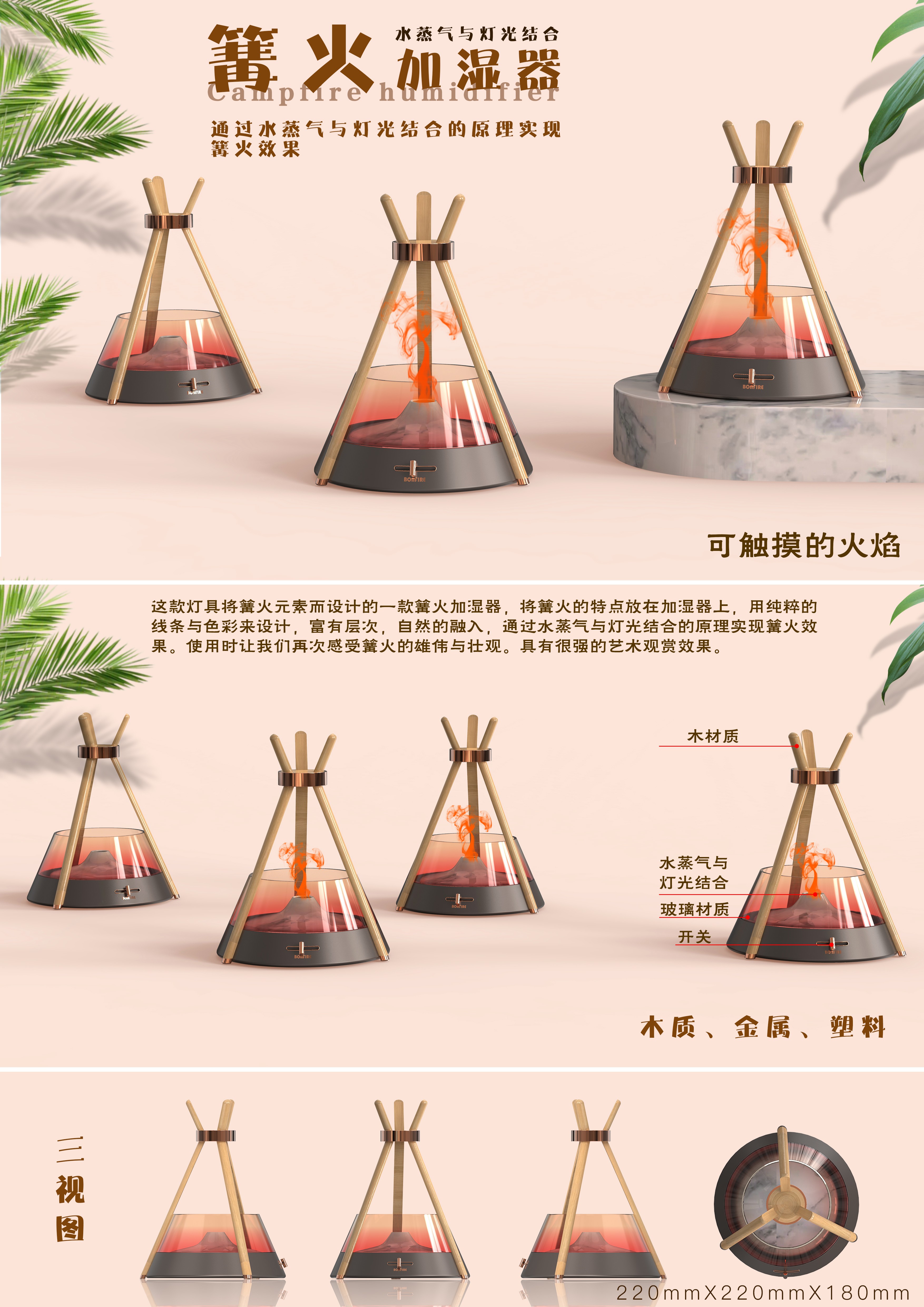 创作思路:这是将篝火元素融入加湿器而设计的一款篝火加湿器,使用时让我们再次感受篝火的雄伟与壮观。